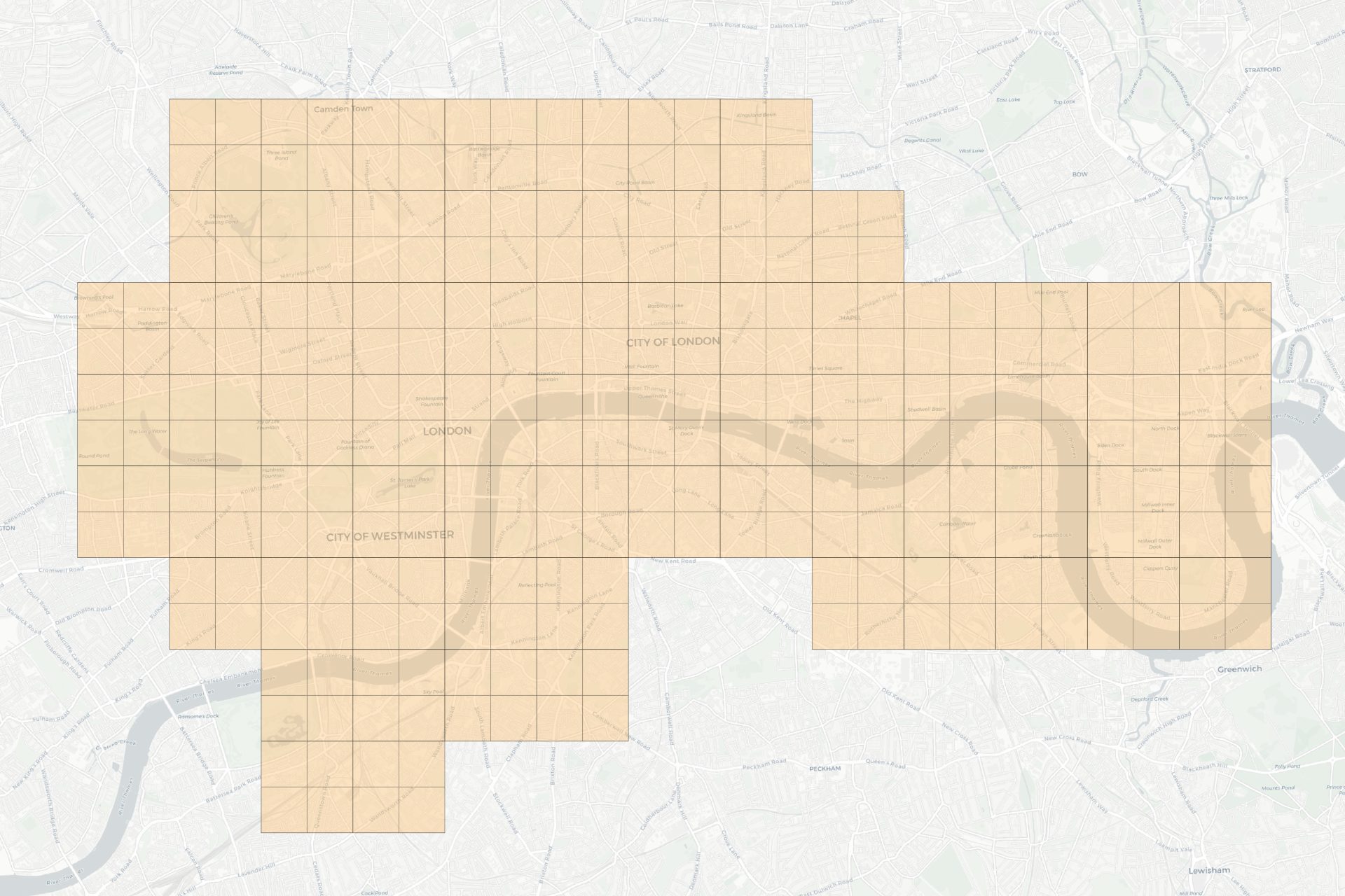 The free London city model is structured in 4 tiles, each tile covers 0.25 km sq (500×500 meters). These four tiles covers OS tile TQ3280 and can be seamlessly overlaid with other data structured in Ordnance Survey coordinate system.