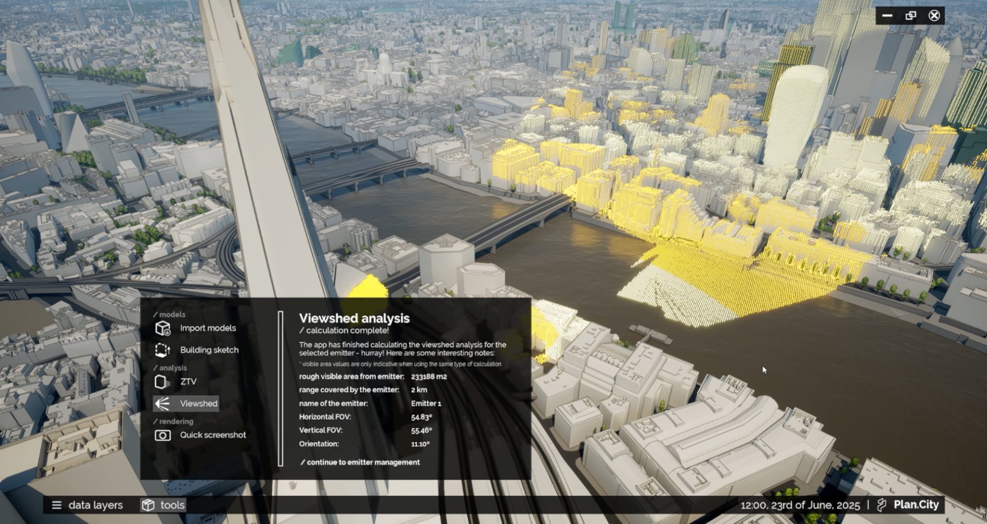 The Viewshed tool allows users to visualise exactly what’s visible from any chosen location. It can be used to both assess what can be seen from a given vantage point, and even compare what multiple emitters can see.