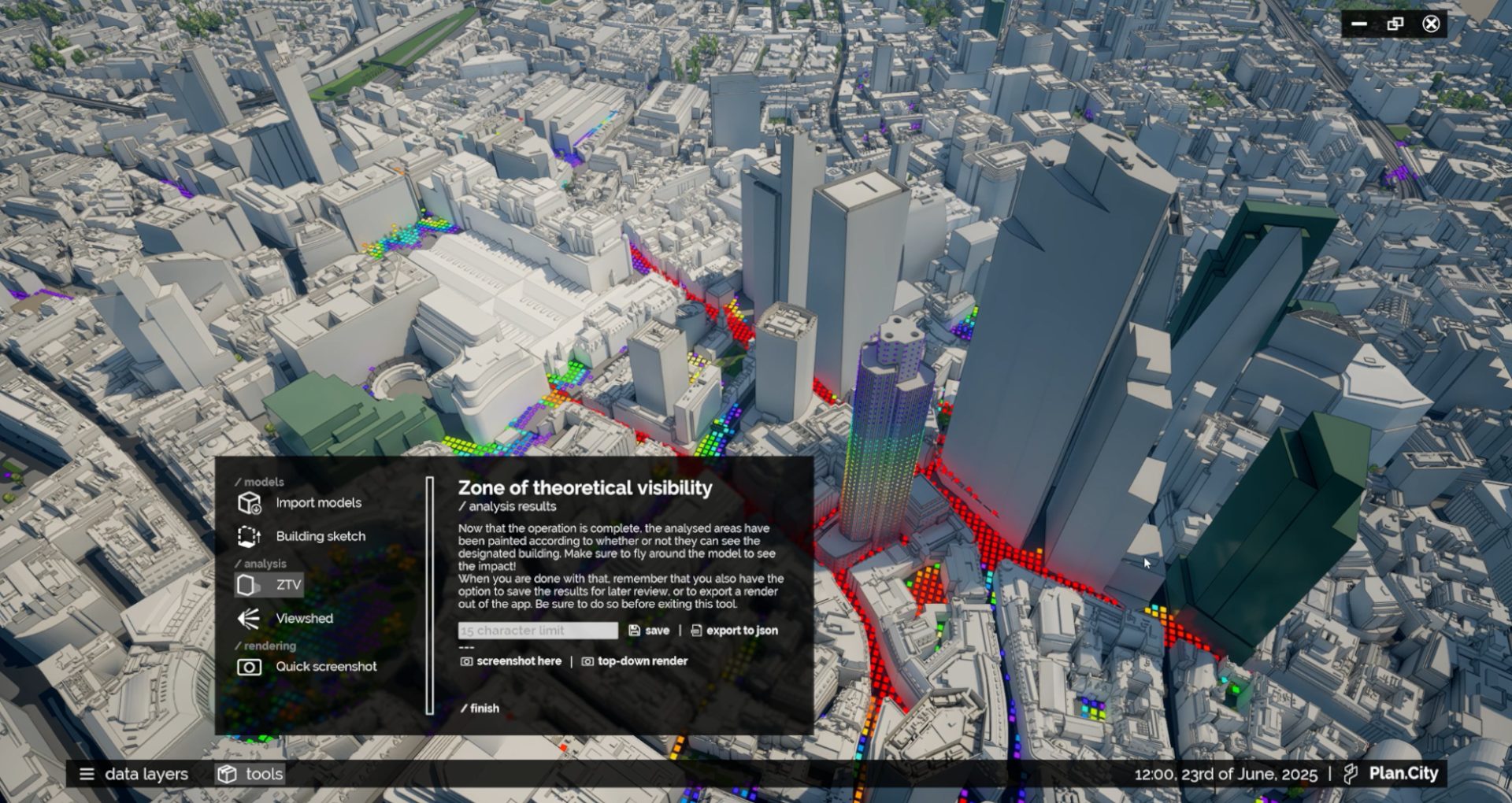 The Zone of Theoretical Visibility tool allows users to conduct rapid visibility studies, allowing to understand where a proposed building can be seen from. The ZTV can help you understand how much of your building can be seen from any point around it, and we’ve split the results by bands to better visualise the results.